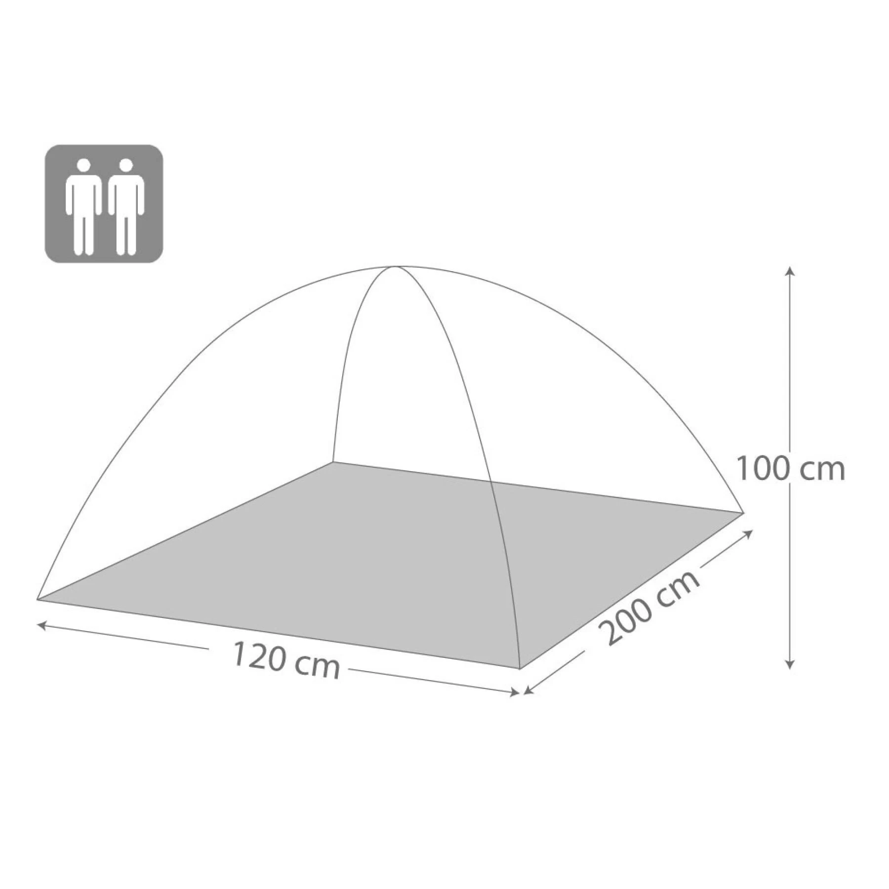 Tente Igloo de dimensions 120x200x100 cm (largeur x profondeur x hauteur), 2 espaces de couchage de 60 cm. Structure en fibre de verre, tente 100% polyester 170T hydrofuge, sol 100% polyéthylène. Porte extérieure zippée avec sangles de fixation latérales et porte intérieure avec moustiquaire.